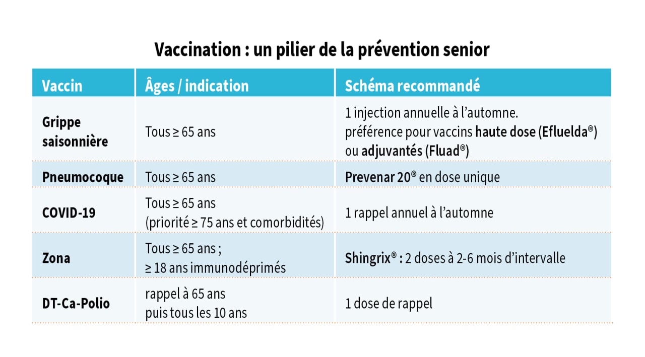 - Grippe saisonnière : une injection annuelle à l’automne, avec une préférence pour les vaccins spécifiquement adaptés aux ≥ 65 ans, tels que Efluelda® ou Fluad®.