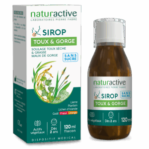 Sirop Toux & Gorge associe lierre, plantain et lichen d’Islande : il hydrate, apaise l’inflammation et favorise l’expulsion du mucus, convenant aux toux grasses ou mixtes.