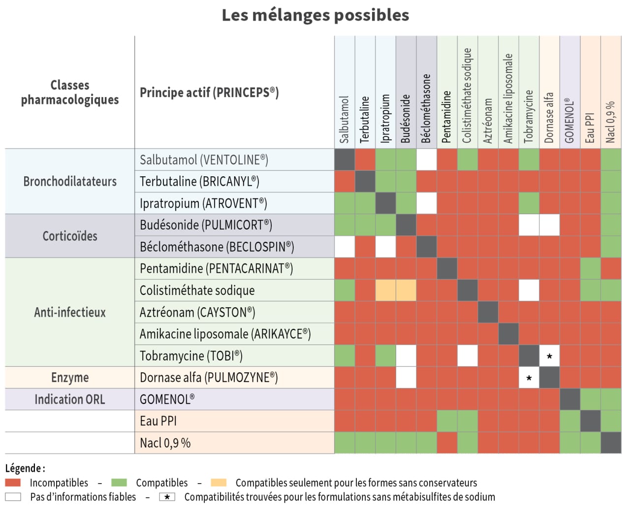 Certaines spécialités (tobramycine, aztréonam) nécessitent un nébuliseur validé par le fabricant. Nous devons systématiquement vérifier la compatibilité dans le RCP.